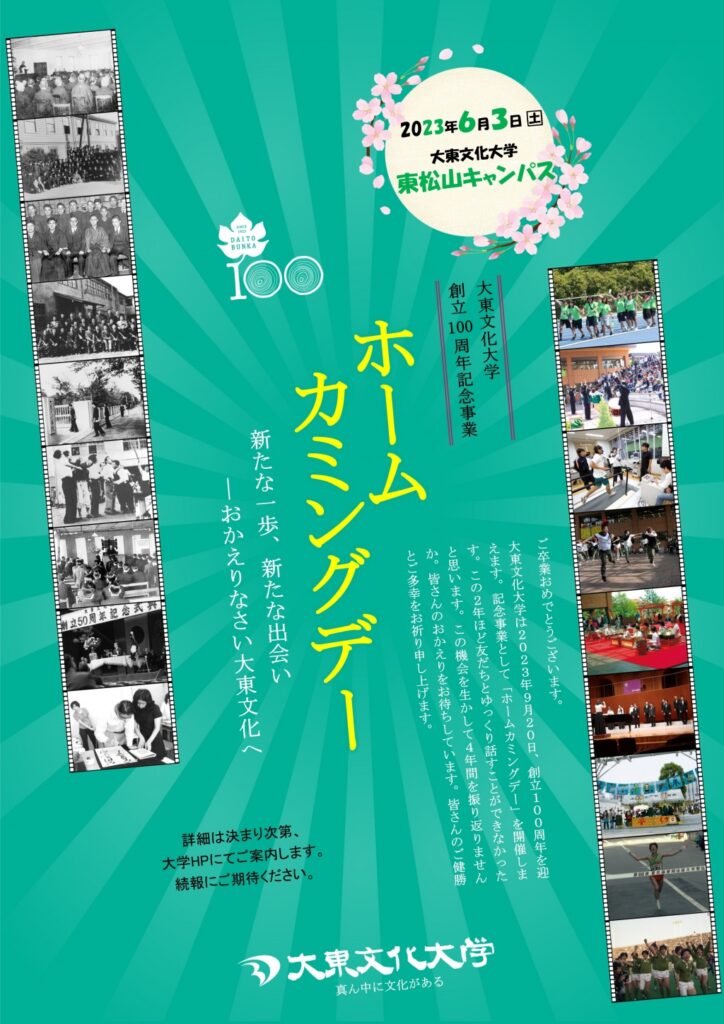 大学創立100周年記念事業として、2023年6月3日に東松山校舎にて「ホームカミングデー」が開催されます!毎年現役が新入生歓迎コンサート(6月祭といいます)をやっていますが、この日に出演が決まり次第ご報告します! 大学公式サイト 大東文化大学創立100周年記念サイト (daito.ac.jp)